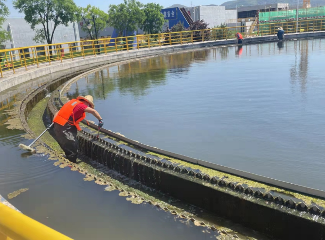 2022-05-09为全面提升城东污水处理厂出水各项指标,强化7S管理和文明创建要求,近日,城东污水处理公司组织职工清洗二沉池,全力保证出水稳定达标排放。此次二沉池清洗工作,重点是对二沉池池壁、出水堰槽附着的藻类进行清理,洗刷出水三角堰蓄积污泥,打捞水面漂浮物,全面清洗